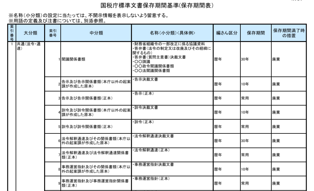 文書の保存期間は「国税庁標準文書保存期間基準(保存期間表)」により厳密に定められていますが、まず難しいのは、作成した文書が大分類・中分類・小分類のどこに該当するのかを適切に判断することです。